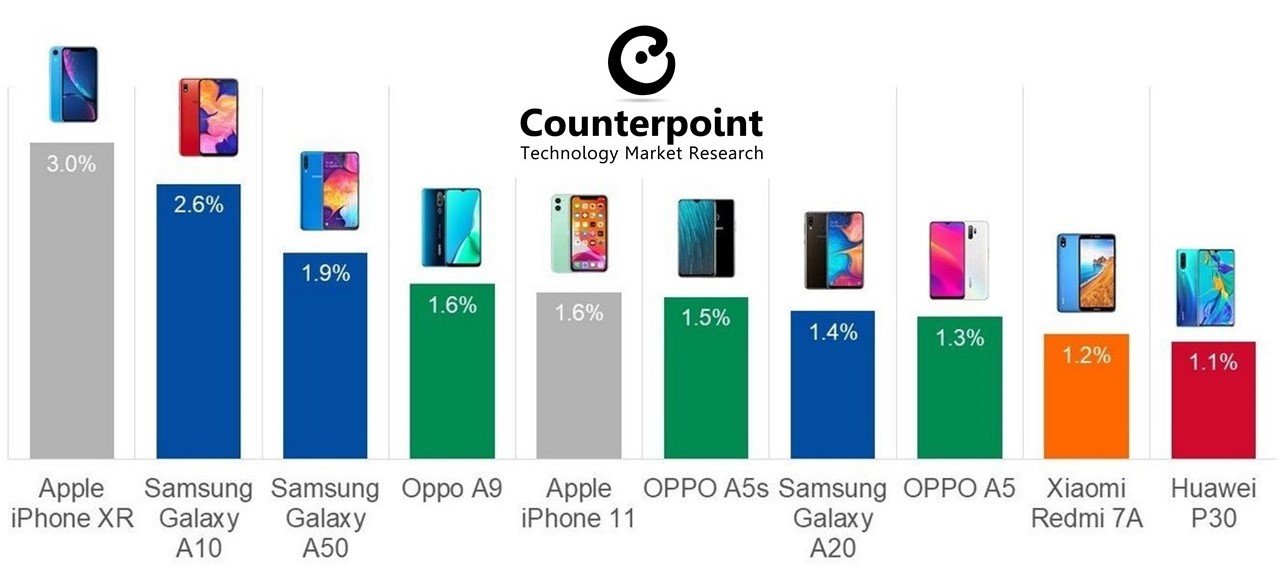 همچنین آیفون ۱۱ نیز در اولین رده بندی خود در سه ماهه معرفیاش در ۱۰ تلفن همراه برتر قرار گرفت.